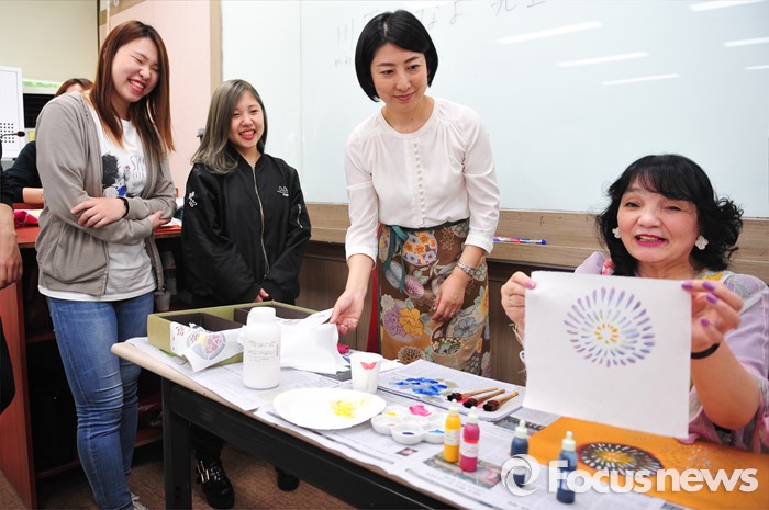 특히 가와하라 가나요씨는 2006년 일본 돗토리현 전통공예사 공인을 받고 2013년에는 서울 일본 대사관 공보문화원에서 전시회를 여는 등 꾸준히 활동하고 있다.지난 16일 오후 서울 광진구 능동로 건국대학교 사범대학 일본어교육과에서 열린‘일본 전통 염색의 이해와 체험' 특강에서 일본 돗토리현(鳥取縣)의 전통 공예사 가와하라 가나요(오른쪽, 川原かなよ)씨가 돗토리현의 향토 공예품인 '다이센 유젠조메(大山友禅染)'를 학생들에게 선보이고 있다. 건국대 사범대학 일어교육과와 교육대학원 일어교육전공 학생지원 프로그램인 ‘일본 문화의 이해와 체험’의 5번째 행사로 진행된 이번 강연에서 학생들은 일본의 전통 염색법인 유젠조메(友禅染)를 기반으로 일본 돗토리현의 향토색이 더해진 '다이센(大山) 유젠조메'를 직접 체험했다고 설명했다. 2016.05.17 포커스포토