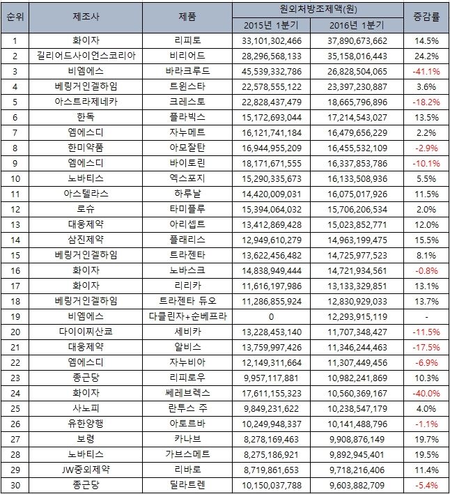 17일 <포커스뉴스>가 의약품통계데이터인 유비스트 데이터를 토대로 전문의약품 9124개(비급여 의약품 제외)의 지난 1분기 원외처방액을 분석한 결과 이같이 조사됐다.