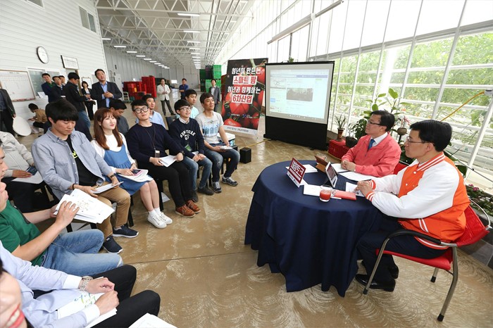 (김제=포커스뉴스) 이동필 농림축산식품부장관이 지난 16일 전북 김제 하랑영농조합법인에서 '청년들과 함께하는 새참토크'를 갖고 있다. <사진제공=농림축산식품부>
