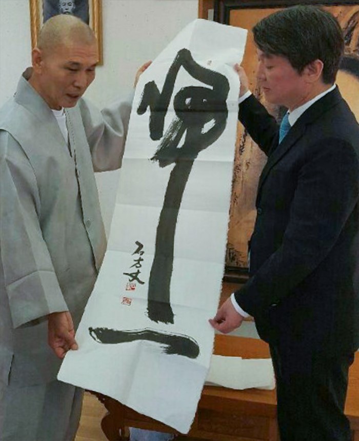 | △ 지선스님에게 붓글씨 전달받는 안철수 |
