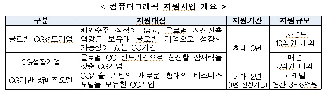 CG는 소프트웨어(SW)기반의 시각‧영상기술로서, 영화, 게임, 애니, 가상현실(VR) 등 경쟁력 있는 고품질 콘텐츠 제작기술‧인력을 제공하는 기반 산업이자 고부가가치 및 일자리 창출효과가 큰 산업이다.