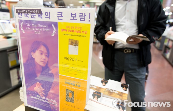 (서울=포커스뉴스) 소설가 한강의 '채식주의자'가 맨부커 인터내셔널상 수상 후 판매량이 급증하고 있다. 17일 오후 서울 서초구 교보문고 강남점에서 독자들이 채식주의자를 살펴보고 있다.