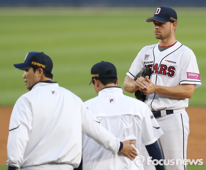 (서울=포커스뉴스) 17일 서울 잠실구장에서 열린 2016프로야구 KIA-두산 경기 2회초 1사 만루에서 두산 한용덕 투수코치(왼쪽)가 투수 보우덴을 안정시키러 마운드로 올라가고 있다.