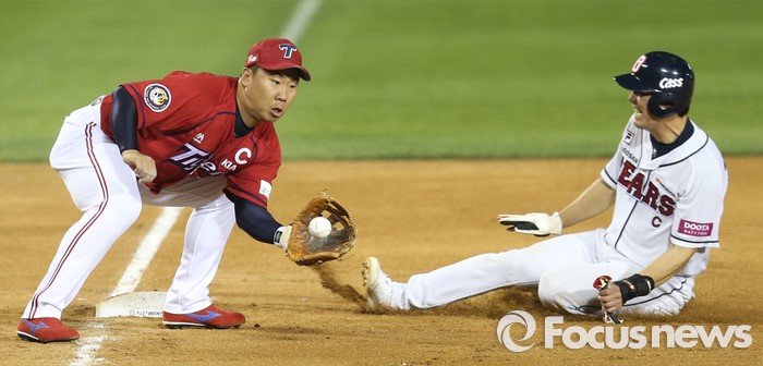 (서울=포커스뉴스) 17일 서울 잠실구장에서 열린 2016프로야구 KIA-두산 경기 7회말 1사 1,2루에서 두산 2루주자 김재호가 도루를 시도, 3루로 슬라이딩하며 세이프되고 있다. KIA 3루수는 이범호.