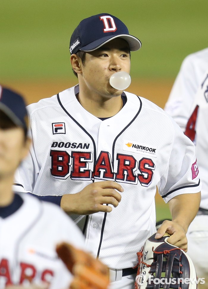 (서울=포커스뉴스) 17일 서울 잠실구장에서 열린 2016프로야구 KIA-두산 경기에서 KIA를 물리치고 두산 김재환이 풍선껌으로 풍선을 불며 덕아웃으로 향하고 있다.