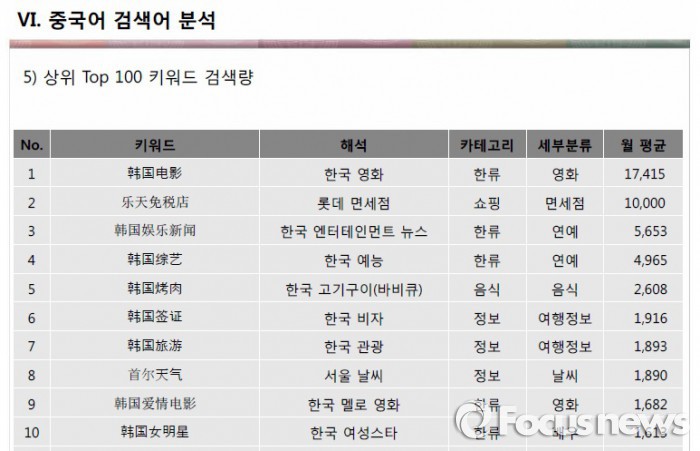 중국어 검색어 전체 순위에서는 ‘한국 영화’에 이어 ‘롯데면세점’이 2위를 차지했다. 이어 엔터테인먼트뉴스 3위, 한국예능 4위, 한국 고기구이 바비큐 5위, 한국 비자 6위, 한국 관광 7위 등 한류·관광지·쇼핑·여행정보 등이 상위권에 포함됐다.