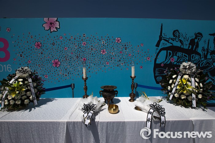(서울=포커스뉴스) 18일 오전 서울 중구 서울시청 앞 광장에서 열린 5.18 민주화운동 기념식 단상에 박원순 서울시장이 헌화한 꽃이 놓여 있다.