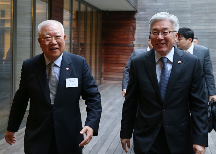 (서울=포커스뉴스) 18일 서울 여의도 대신증권에서 열린 ‘글로벌문화경제포럼’에 참석한 김종덕 문체부 장관이 박재갑 글로벌문화경제포럼 공동 회장과 함께 강연장으로 이동하고 있다. <사진제공=문화체육관광부>