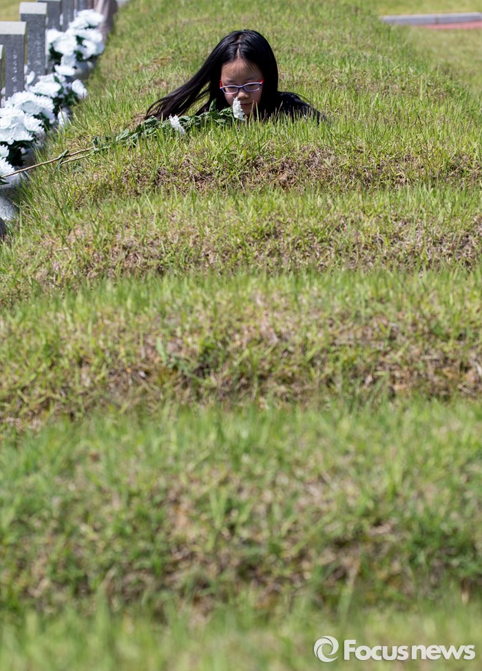 (광주=포커스뉴스) 36주년 5·18민주화운동 기념식이 거행된 18일 오전 광주 북구 운정동 5·18민주묘지에서 명경하(12)양이 조부 명노근씨의 산소를 정돈하고 있다.