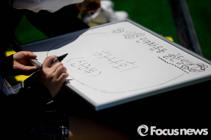 (서울=포커스뉴스) 18일 오후 서울 중구 서울시청 앞 광장에서 열린 '5.18 민주화운동 36주년 기념식 - 5.18 골든벨 행사'에 참석한 학생들이 퀴즈 문제를 풀고 있다.