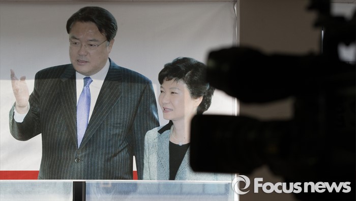 (공주=포커스뉴스) 정진석 새누리당 원내대표가 18일 오후 충남 공주 지난 선거 당시 사용했던 선거사무소에서 측근들과 논의를 하고 있는 가운데 사무소에 선거당시 붙여 놓은 현수막에 박근혜 대통령과 함께 촬영한 사진이 보이고 있다.