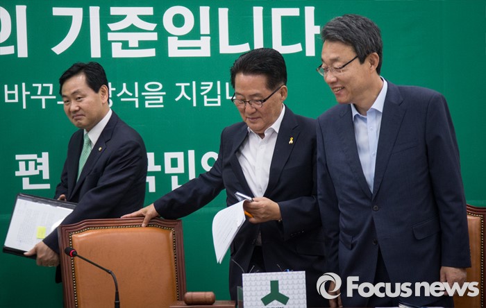 (서울=포커스뉴스) 박지원(가운데) 국민의당 원내대표와 김성식(오른쪽) 정책위의장, 김관영 원내수석부대표가 19일 오전 서울 여의도 국회에서 열린 국민의당 원내대책회의에 참석하고 있다.