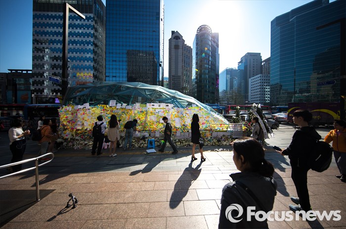 (서울=포커스뉴스) 19일 오전 서울 서초구 강남역 10번 출구에서 출근길 시민들이 '묻지마 살인' 피해자를 추모하고 있다.
