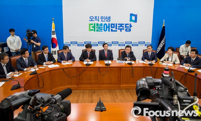 (서울=포커스뉴스) 19일 오전 여의도 국회에서 열린 더불어민주당 원내대표단 회의에 참석한 우상호 신임 원내대표가 모두발언 하고 있다.