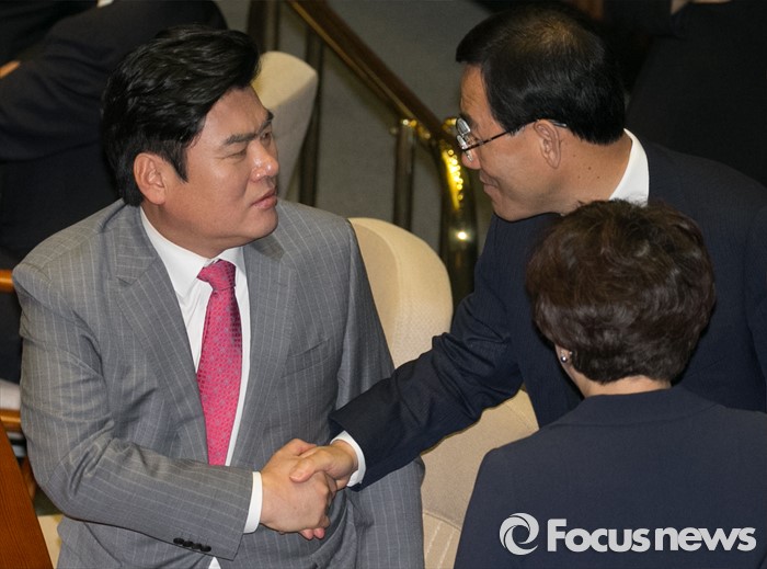 (서울=포커스뉴스) 19일 오전 서울 여의도 국회에서 열린 342회 국회(임시회) 1차 본회의에 참석한 원유철(왼쪽) 새누리당 전 원내대표와 주호영 무소속 의원이 대화하고 있다.