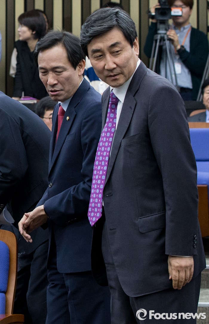 (서울=포커스뉴스) 19일 오전 여의도 국회에서 열린 더불어민주당 의원총회에 우상호 신임 원내대표와 이종걸 전 원내대표가 참석하고 있다.