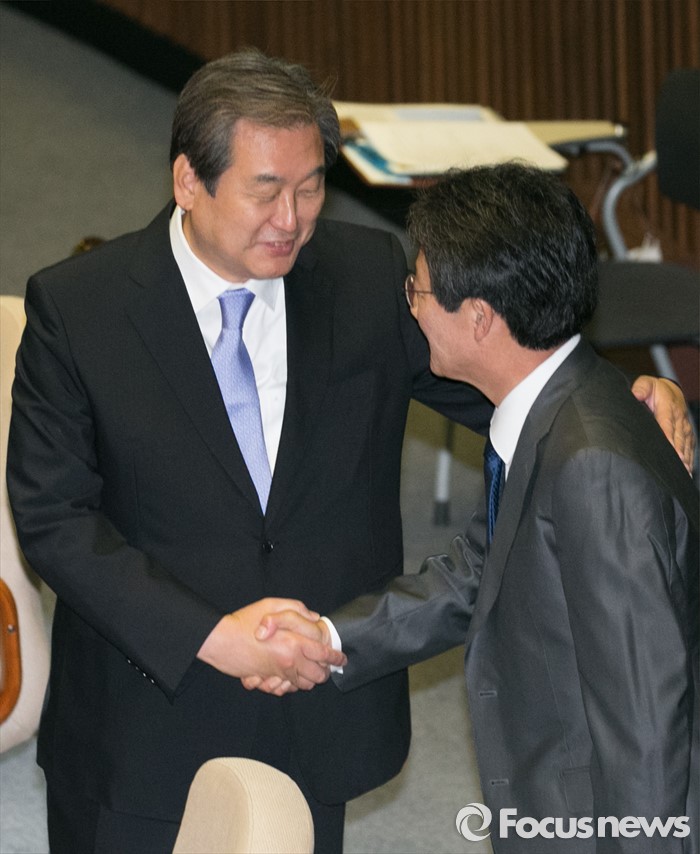 (서울=포커스뉴스) 19일 오전 서울 여의도 국회에서 열린 342회 국회(임시회) 1차 본회의에 참석한 김무성(왼쪽) 새누리당 전 대표와 유승민 무소속 의원이 인사하고 있다.