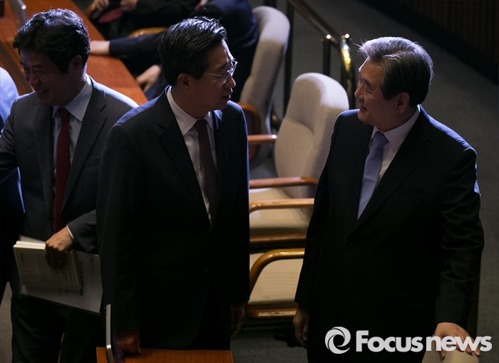 (서울=포커스뉴스) 19일 오전 서울 여의도 국회에서 열린 342회 국회(임시회) 1차 본회의에 참석한 김무성(오른쪽) 새누리당 전 대표와 전하진 의원이 대화하고 있다.