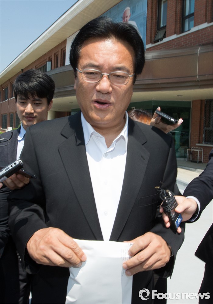 (대전=포커스뉴스) 정진석 새누리당 원내대표가 19일 오전 대전 동구 천주교 대전교구청을 찾아 유흥식 주교와 면담을 갖고 교구를 나서고 있다.