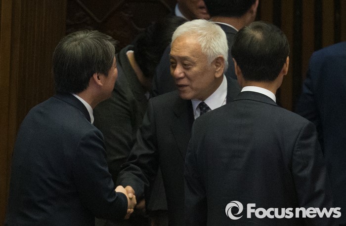 (서울=포커스뉴스) 19일 오전 서울 여의도 국회에서 열린 342회 국회(임시회) 1차 본회의에서 안철수(왼쪽) 국민의당 대표와 김한길 의원이 인사를 나누고 있다.