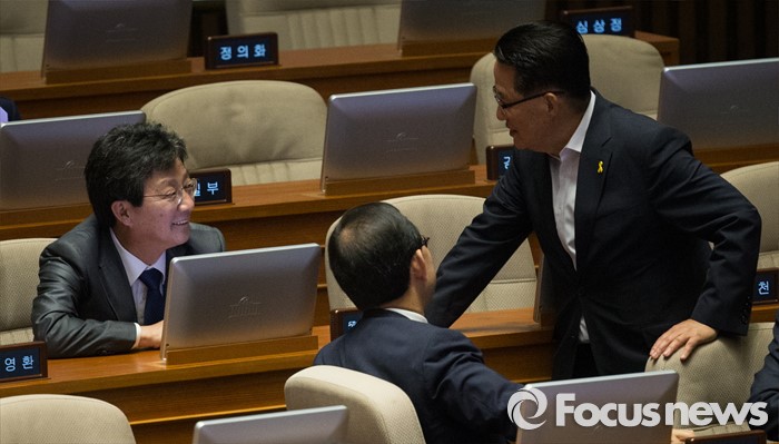 (서울=포커스뉴스) 19일 오전 서울 여의도 국회에서 열린 342회 국회(임시회) 1차 본회의에서 유승민(왼쪽) 무소속 의원과 박지원(오른쪽) 국민의당 원내대표가 대화하고 있다.
