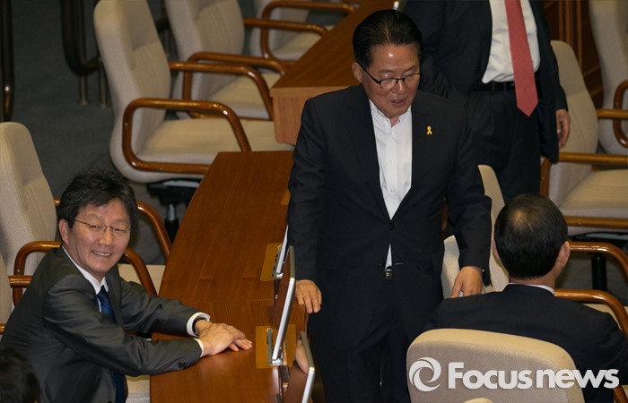 (서울=포커스뉴스) 19일 오전 서울 여의도 국회에서 열린 342회 국회(임시회) 1차 본회의에 참석한 박지원(가운데) 국민의당 원내대표와 유승민(왼쪽), 주호영 무소속 의원이 대화하고 있다.