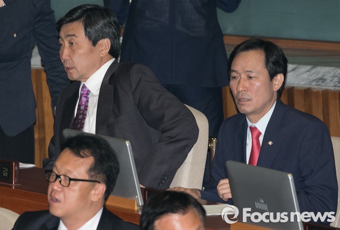 (서울=포커스뉴스) 19일 오전 서울 여의도 국회에서 열린 342회 국회(임시회) 1차 본회의에 참석한 우상호(오른쪽) 더불어민주당 원내대표와 이종걸 전 원내대표가 자리하고 있다.