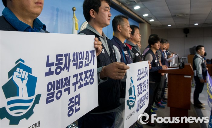 (서울=포커스뉴스) 19일 오전 여의도 국회 정론관에서 열린 '조선산업 발전과 구조조정에 관한 조선업종노조연대 대표자' 기자회견에 참석한 대표자들이 구조조정, 매각, 합병 중단을 요구하는 손팻말을 들고있다.
