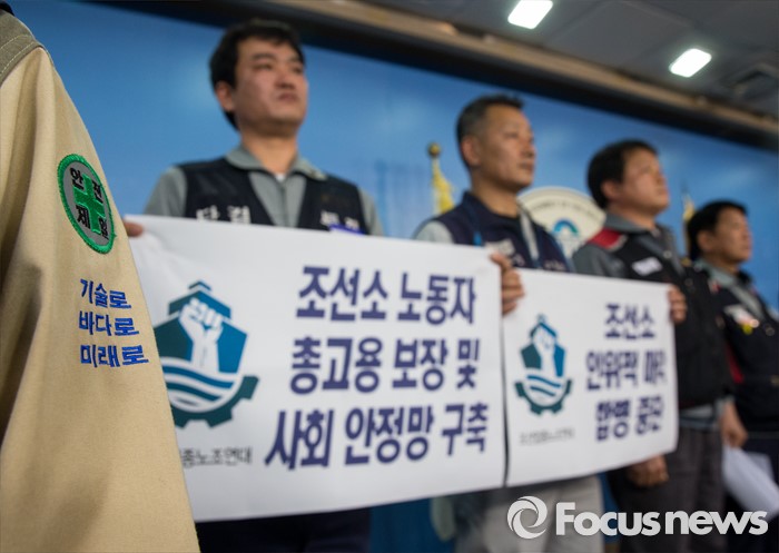 (서울=포커스뉴스) 19일 오전 여의도 국회 정론관에서 열린 '조선산업 발전과 구조조정에 관한 조선업종노조연대 대표자' 기자회견에 참석한 대표자들이 구조조정, 매각, 합병 중단을 요구하는 손팻말을 들고있다.