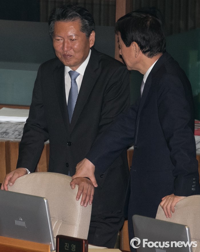(서울=포커스뉴스) 19일 오전 서울 여의도 국회에서 열린 342회 국회(임시회) 1차 본회의에 참석한 정청래(왼쪽), 진영 더불어민주당 의원이 대화하고 있다.