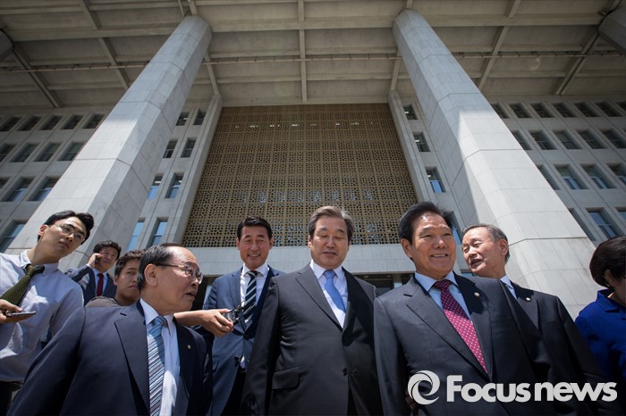 (서울=포커스뉴스) 19일 오후 서울 여의도 국회에서 열린 342회 국회(임시회) 1차 본회의에 참석한 김무성(가운데) 새누리당 전 대표가 본회의가 정회된 후 국회를 빠져나오고 있다.