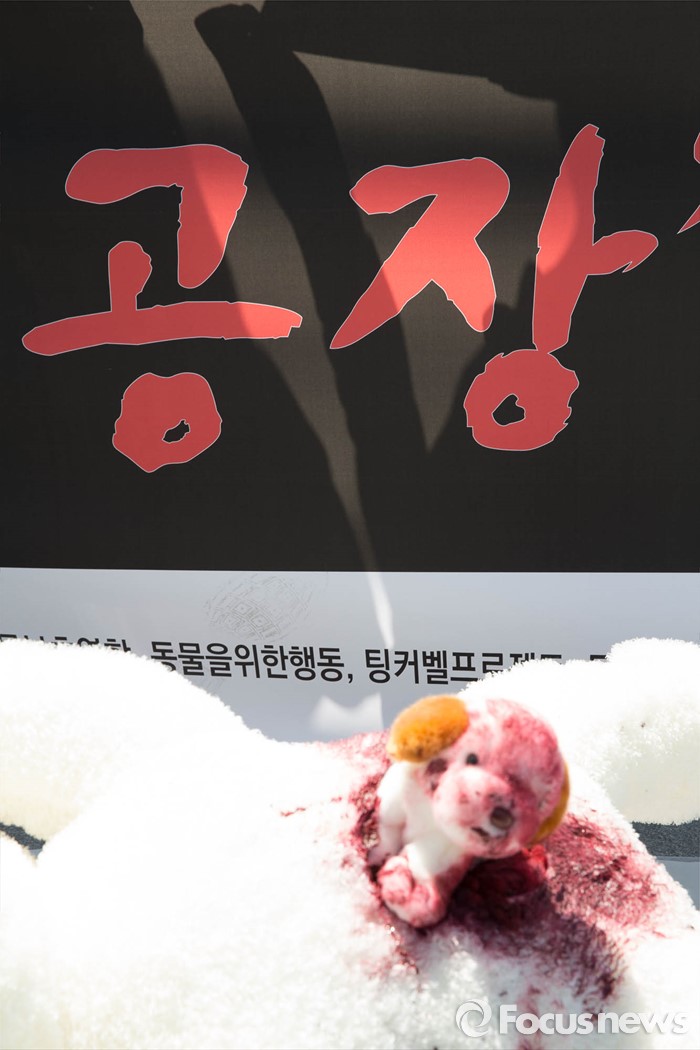 (서울=포커스뉴스) 19일 오후 서울 종로구 정부서울청사앞에서 동물자유연대 및 시민단체들이 강아지 공장 문제 해결을 촉구하며 퍼포먼스를 하고 있다.