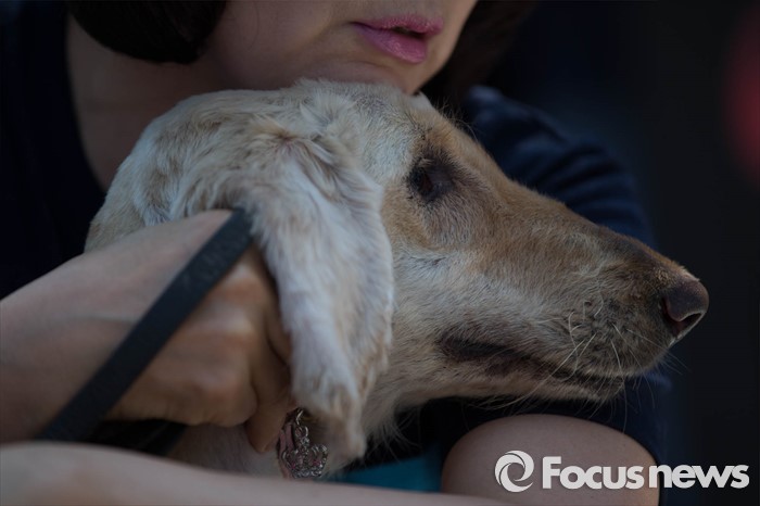 (서울=포커스뉴스) 19일 오후 서울 종로구 정부서울청사앞에서 동물자유연대 및 시민단체들이 강아지 공장 문제 해결을 촉구하며 기자회견을 하고 있다. 실제 강아지 공장에서 구조된 번식견 신디의 모습.