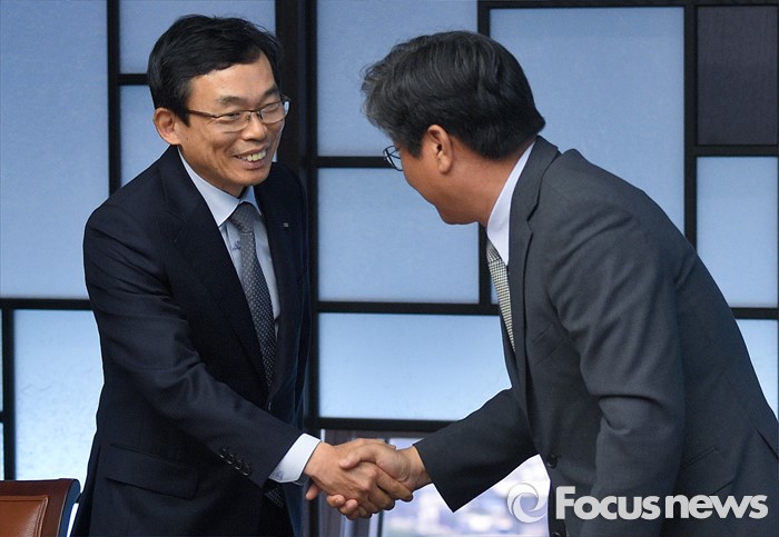 (서울=포커스뉴스) 이춘석(오른쪽) 더불어민주당 어버이연합 등 불법 자금 지원 의혹 규명 진상조사 태스크포스(TF) 위원장이 19일 오후 서울 여의도 전국경제인연합회관을 찾아 현장 조사에 앞서 이승철 상근부회장과 인사를 하고 있다.