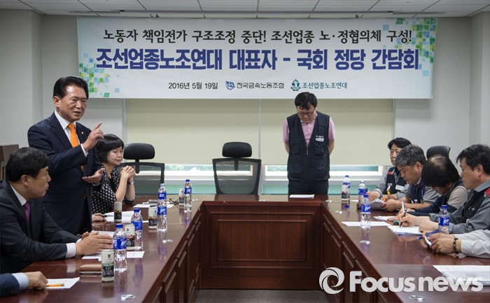 (서울=포커스뉴스) 19일 오후 서울 여의도 국회 의원회관에서 조선업종노조연대 대표자들과 각 정당 의원들이 간담회를 갖고 있다.