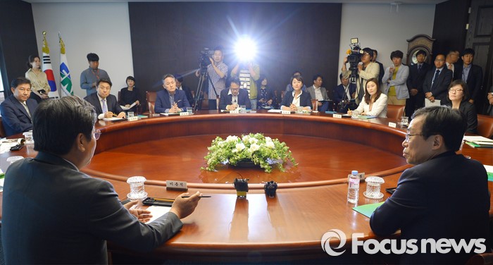 (서울=포커스뉴스) 현장조사에 나선 이춘석(왼쪽) 더불어민주당 어버이연합 등 불법 자금 지원 의혹 규명 진상조사 태스크포스(TF) 위원장이 19일 오후 서울 여의도 전국경제인연합회관에서 이승철(오른쪽) 상근부회장 등과 간담회를 하고 있다.