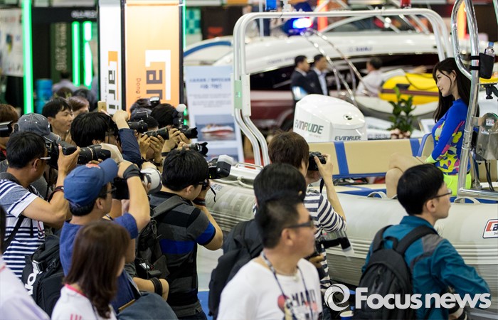 (고양=포커스뉴스) 19일 오후 경기 고양시 킨텍스 제1전시관에서 열린 2016 경기국제보트쇼에 참가한 모델이 보트 위에서 포즈를 취하고 있다.