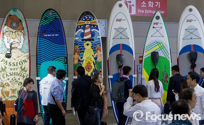 (고양=포커스뉴스) 19일 오후 경기 고양시 킨텍스 제1전시관에서 열린 2016 경기국제보트쇼를 찾은 관람객들이 다양한 서핑보드를 살펴보고 있다.