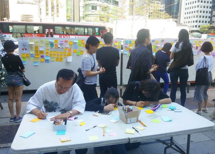 현재 강남역 10번 출구 오른편에는 추모의 글귀를 적은 포스트잇 메모를 붙일 수 있는 대형 패널이 설치됐으며 책상과 의자도 준비된 상태다.