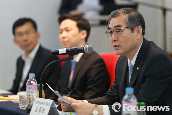 (서울=포커스뉴스) 정재찬(오른쪽) 공정거래위원회 위원장이 19일 오후 서울 강남구 위메프 본사에서 열린 '전자상거래 업계대표 간담회'에 참석해 모두발언 하고 있다.