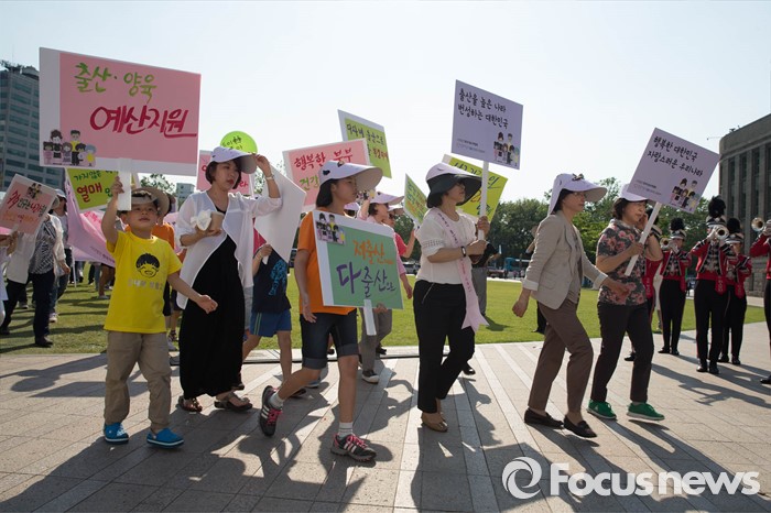 (서울=포커스뉴스) 19일 오후 서울시청광장에서 '제1회 건강가정 다출산 범국민대회'에 참석한 시민들이 걷기대회를 하고 있다.