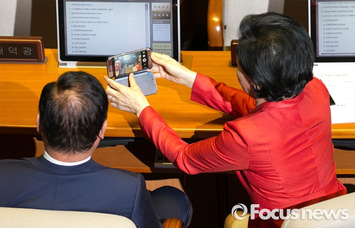 (서울=포커스뉴스) 19일 오후 서울 여의도 국회에서 열린 342회 국회(임시회) 1차 본회의에 참석한 배덕광(왼쪽), 류지영 새누리당 의원이 기념촬영을 하고 있다.