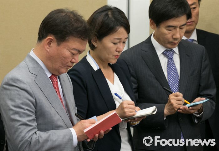 (서울=포커스뉴스) 19일 오후 서울 여의도 국회 귀빈식당에서 20대 국회 원구성 등 협상을 위해 열린 3당 원내대표 회동에 참석한 3당 원내대변인들이 지도부의 발언을 적고 있다. 왼쪽부터 민경욱 새누리당 원내대변인, 이재정 더불어민주당 원내대변인, 이용호 국민의당 원내대변인.