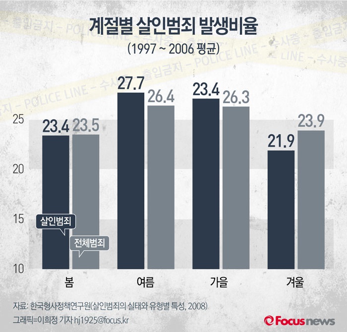 형사정책연구원이 발간한 '살인범죄의 실태와 유형별 특성(2008)'에 따르면 연간 발생하는 살인범죄 중 27.7%가 여름(7~9월)에 발생했다. 겨울(12월~2월)에 발생한 살인범죄 비율은 21.9%로 여름에 비해 눈에 띄게 낮았다.