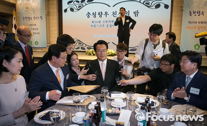 (서울=포커스뉴스) 19일 오후 여의도 서울시티클럽에서 열린 충청 향우 친선의 밤 행사에 참석한 정진석 새누리당 원내대표가 취재진 질문을 받고 있다. 오른쪽부터 권선택 대전시장, 정 원내대표, 이은권 새누리당 당선인, 김수민 국민의당 당선인.