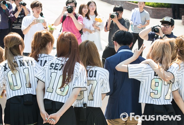(서울=포커스뉴스) 19일 오후 서울 종로구 성균관대 캠퍼스에서 걸그룹 우주소녀의 멤버들이 'Y24 스쿨어택' 행사에 참여해 팬들과 기념사진을 찍고 있다.