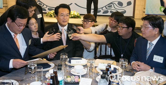 올해 말 반 총장의 임기가 끝나는 가운데 충청권의 결속 움직임은 더욱 활발해질 것으로 관측된다.19일 오후 여의도 서울시티클럽에서 열린 충청 향우 친선의 밤 행사에 참석한 정진석 새누리당 원내대표가 취재진 질문을 받고 있다. 오른쪽부터 권선택 대전시장, 정 원내대표, 이은권 새누리당 당선인. 2016.05.19 박동욱 기자