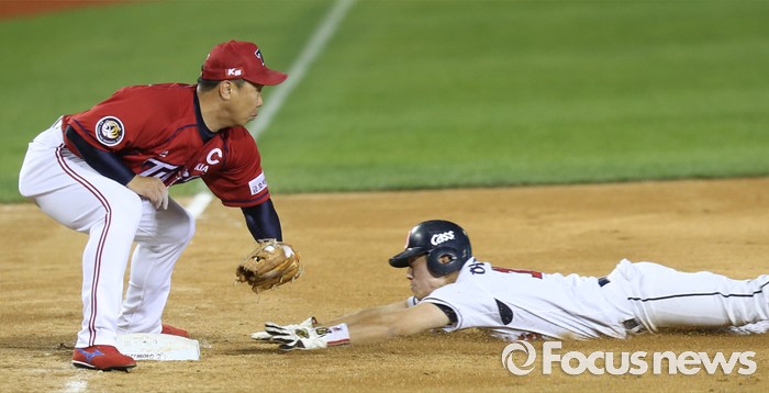 (서울=포커스뉴스) 19일 서울 잠실구장에서 열린 2016프로야구 KIA-두산 경기 4회말 1사 2루에서 좌익수 왼쪽으로 빠지는 2루타로 역전 주자를 불러들인 두산 허경민이 김재호 타석때 3루 도루를 시도해 세이프되고 있다.