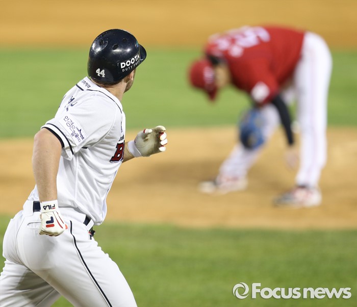 (서울=포커스뉴스) 19일 서울 잠실구장에서 열린 2016프로야구 KIA-두산 경기 5회말 2사 1루에서 두산 에반스가 좌월 2점 홈런을 치고 타구를 바라보며 뛰어 나가고 있다.