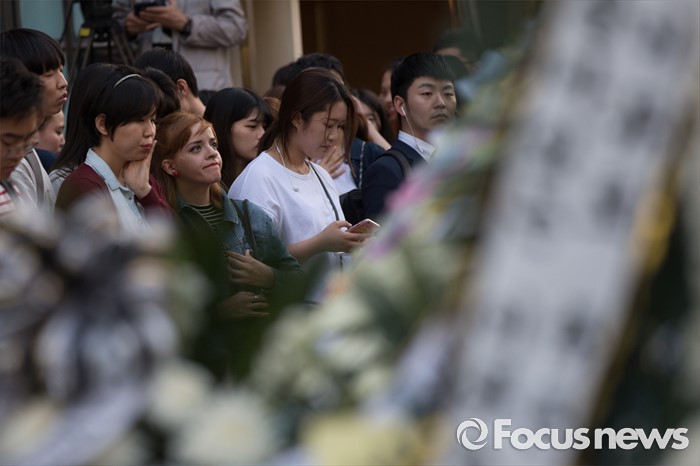 (서울=포커스뉴스) 19일 오후 서울 서초구 강남역 10번출구에서 시민들이 '강남 묻지마 살인' 피해자를 추모하고 있다.